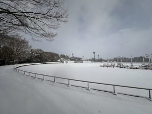 2/8には関東圏では積雪があり、さいたまマラソンをはじめとした大会や各地ランニングイベントが残念ながら中止となってしまいました。岩名運動公園一帯も雪で覆われました。しかし練習会の日でもあった2/11の冷たい雨により、幸いにも雪がとけてくれました。